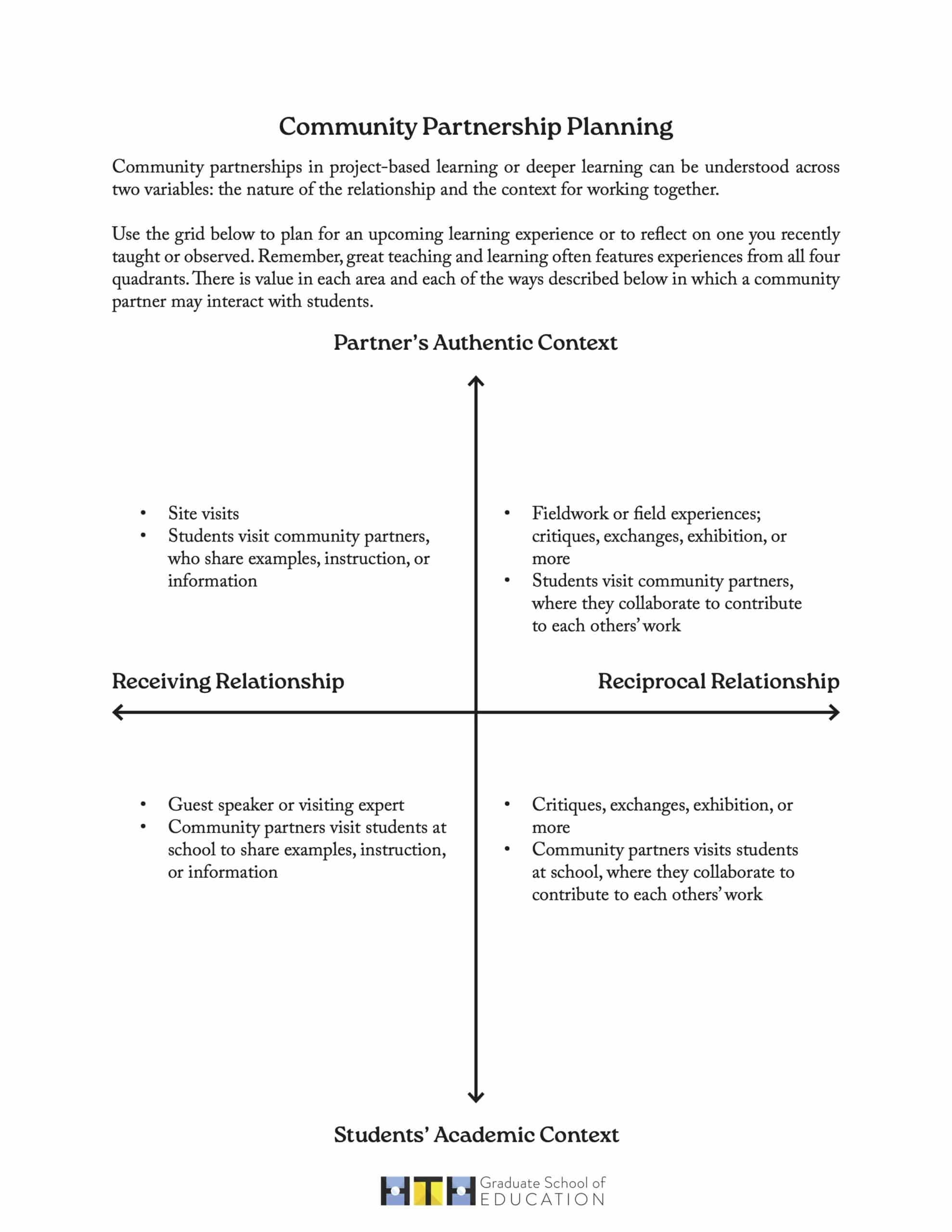 Community partnerships in project-based learning, deeper learning, or career technical education can be understood across two variables: the nature of the relationship between students and the partner, and the context for working together.