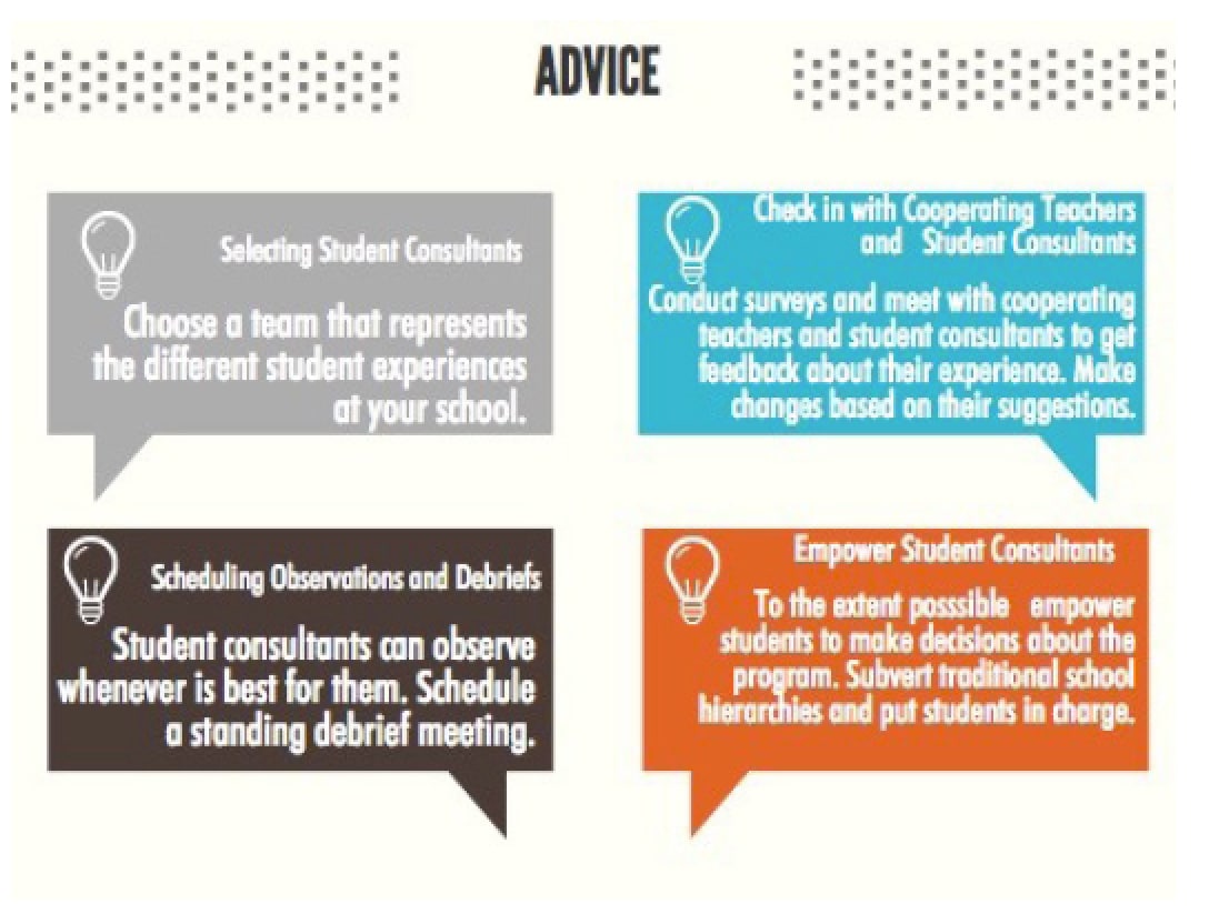 In other contexts, such as working with younger students, in a more traditional school setting, or with veteran teachers, this model of student consulting might have to be adapted. One alternative structure would be to have older students serve as student consultants at the elementary school level and middle school level to ensure an appropriate level of maturity and sensitivity. In traditional school settings and with veteran teachers we could envision the program being voluntary and scaling up organically based on the positive reports of teachers who choose to participate.