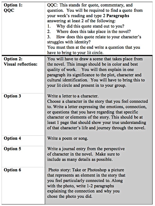 “I think that the options are ok. I liked the other lit circles better because I feel like having to pick an option makes it stressful. I did not know which option to do so I ended up doing my lit circle the day before it was due. I like how we had a structure on the other lit circle.” —Zoe